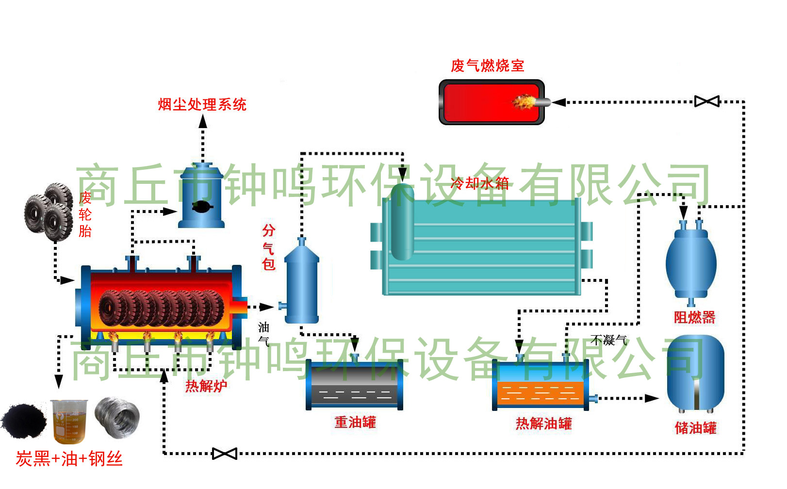 為了解決廢舊輪胎,本廠生產(chǎn)的輪胎裂解設(shè)備確保無(wú)三廢排放。設(shè)備有尾氣燃燒再利用裝置,確保無(wú)味。以燃料裂解油為例(也可以用天然氣),設(shè)備配有除塵器,煙塵排放達(dá)標(biāo),整個(gè)循環(huán)冷卻系統(tǒng)水循環(huán)且無(wú)污染,絕無(wú)廢水排放;廢渣因經(jīng)過(guò)500多度的高溫處理,無(wú)任何的毒性碳黑,且炭黑可以精煉,應(yīng)用范圍很廣,不凝氣是廢輪胎熱解的能量來(lái)源,油品和熱解炭黑為廢輪胎熱解的主要產(chǎn)品,而從產(chǎn)品的品質(zhì)和價(jià)值講,裂解設(shè)備很好的解決了垃圾污染問(wèn)題,不會(huì)造次二次污染。在解決問(wèn)題的同時(shí)也創(chuàng)造了巨大的經(jīng)濟(jì)效益。